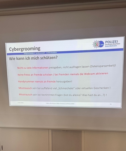 Am 25.02.2026 besuchte uns wieder die Kriminalhauptkommisarin Frau Kleppe und klärte uns über Gefahren und Straftaten im Internet auf. Wir lernten viel über richtige Verhaltensweisen im Umgang mit den sozialen Medien und